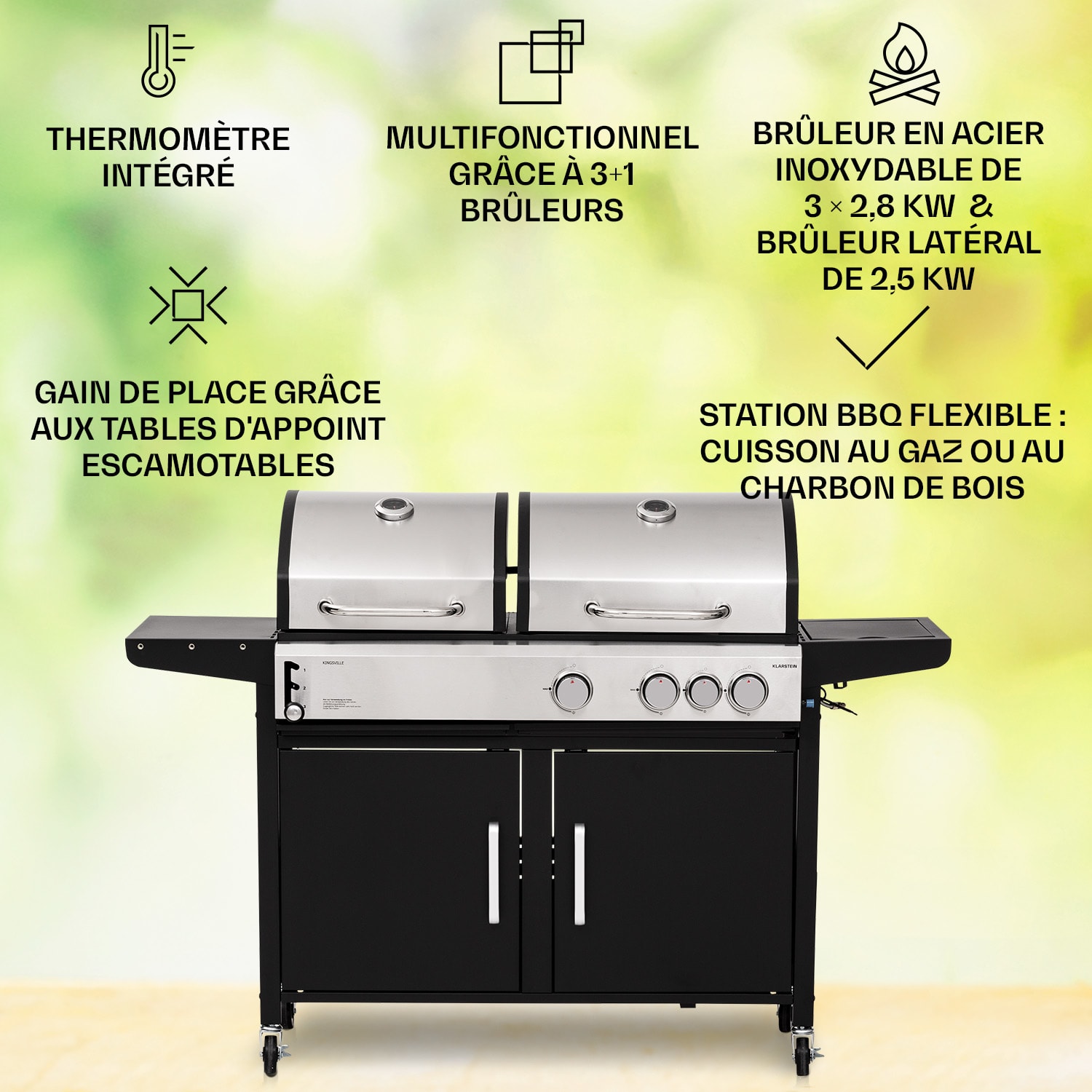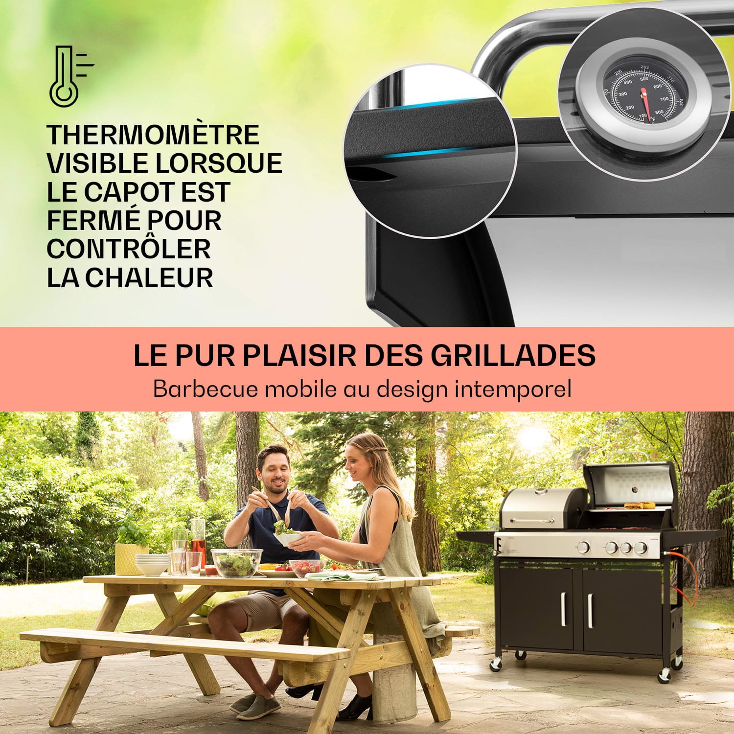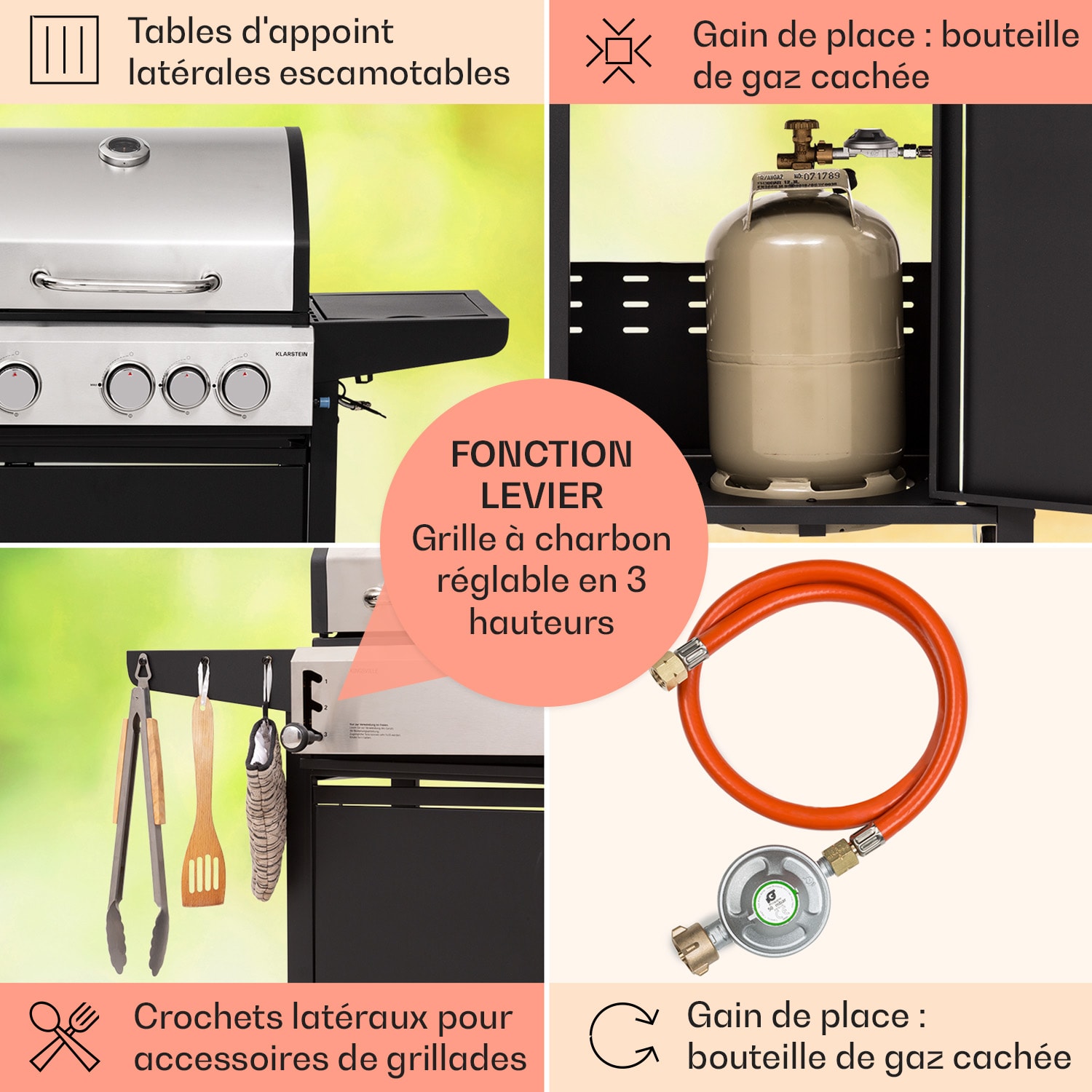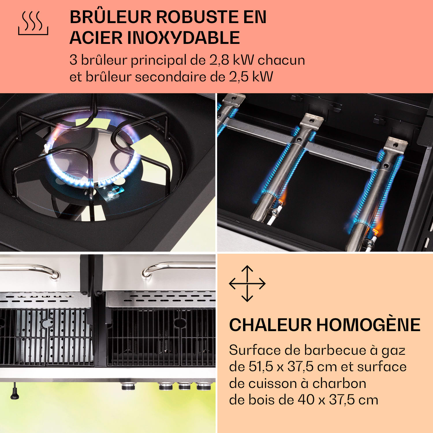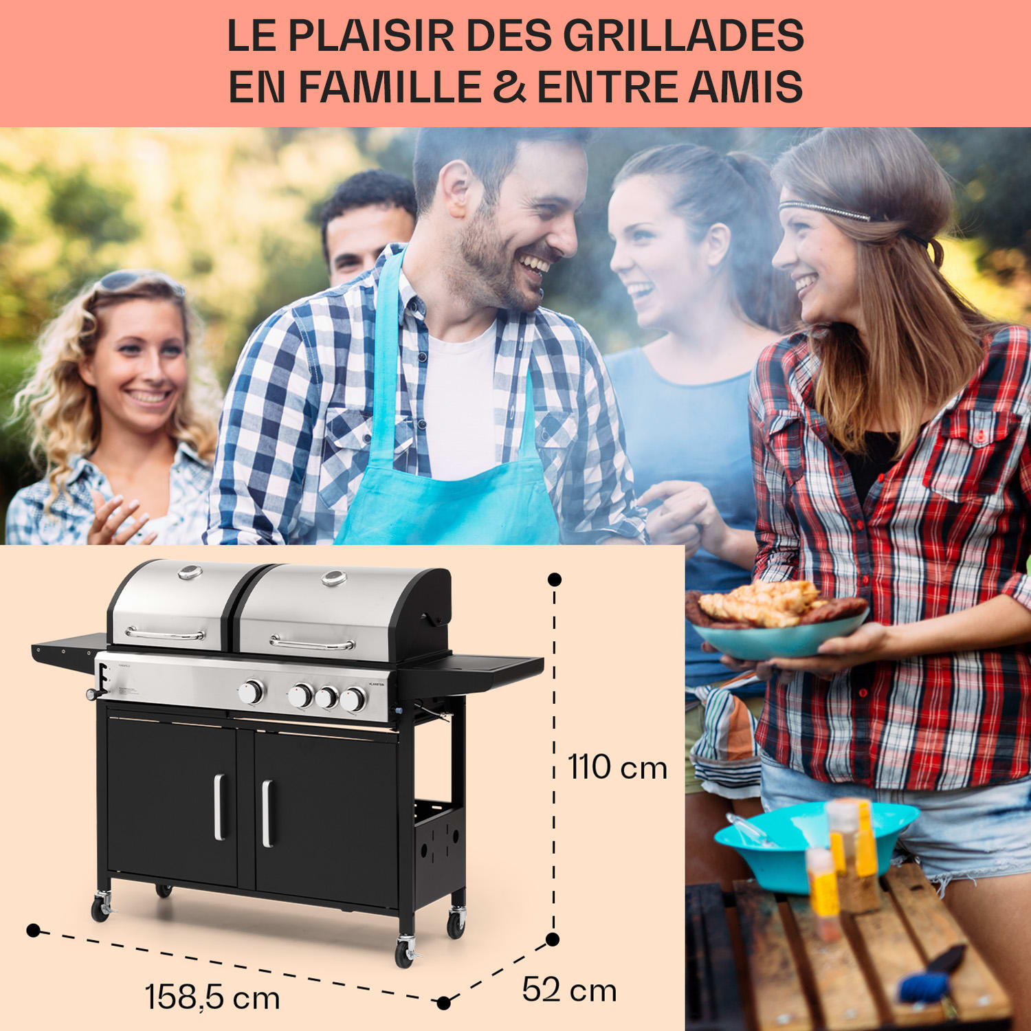 En soi, le gril est un petit bijou avec des fonctionnalités suffisantes pour les "petits projets de gril". Donc, jusqu'à 4 à 8 personnes, vous pouvez vous y rendre, au-delà, la zone de grillade disponible est un peu trop petite. Vous ne devriez pas non plus vous attendre à un grill professionnel ! Ce que nous avons aimé : - les dimensions compactes (1,5m de large) et toujours transportable (35kg) - les matériaux (double capot inox, belle grille en fonte, roues stables) - la finition est propre et l'épaisseur de tôle est suffisante - montage rapide Ce que nous n'avons pas trop aimé : - le réglage en hauteur par 6 annoncé sur le gril à charbon n'est que de 3 (trois positions sur le levier) - la bouteille de gaz de 11 kg annoncée ne rentre pas sous le gril, seule la bouteille de 5 kg - avec les deux grilles, lorsque le volet est fermé, il y a une grande zone à l'arrière (40x10cm) ouverte où la chaleur s'échappe. Ne peut être vu sur aucune photo, mais empêche d'atteindre des températures plus élevées. J'ai pu atteindre un maximum de 235°C sur les deux grilles. - Le brûleur latéral s'est éteint plusieurs fois à cause d'un vent léger (dangereux si vous ne le remarquez pas) Et je peux toujours recommander le gril, il a l'air bien et j'ai eu beaucoup de plaisir à griller.